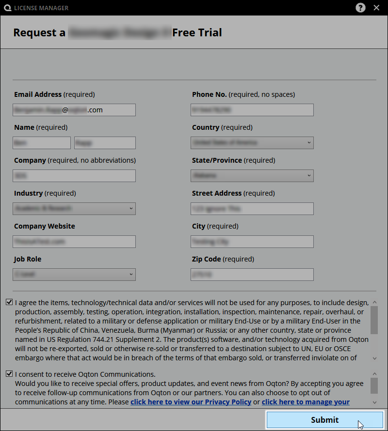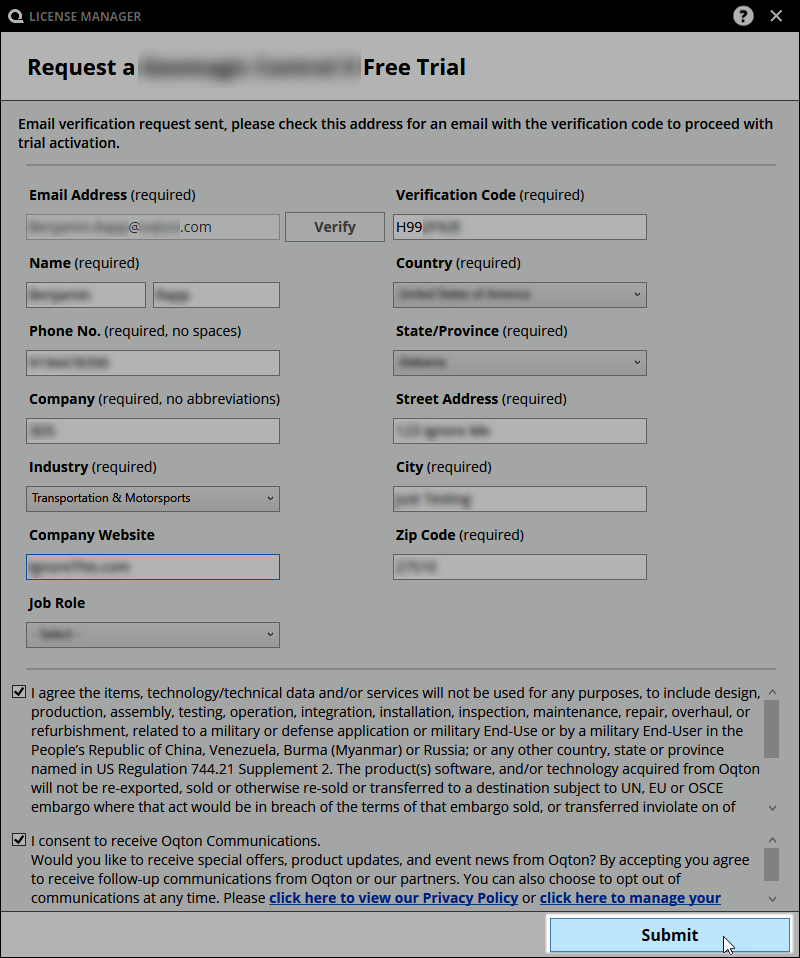 7) Fill out the contact information and click Submit. This form only allows English (Latin) characters without any accents.